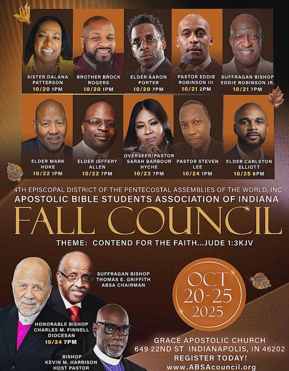 This august body of Pentecostal assemblies in the state of Indiana has a distinguished history, boasting such exemplary leadership as Bishop Karl F. Smith, Bishop Oscar (Sin-Killin’) Sanders, Bishop James Edison Tyson (twice), Bishop Charles Watkins, Bishop Charles A. Sims, and now the very distinguished Bishop Charles M. Finnell.